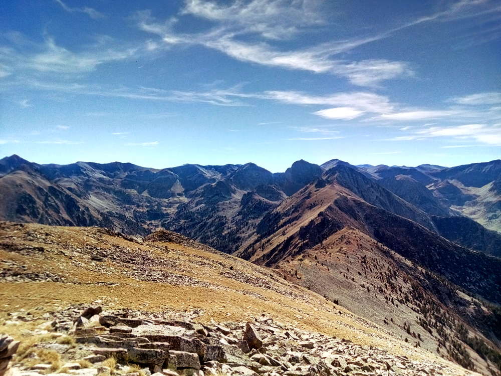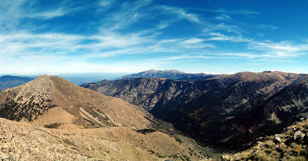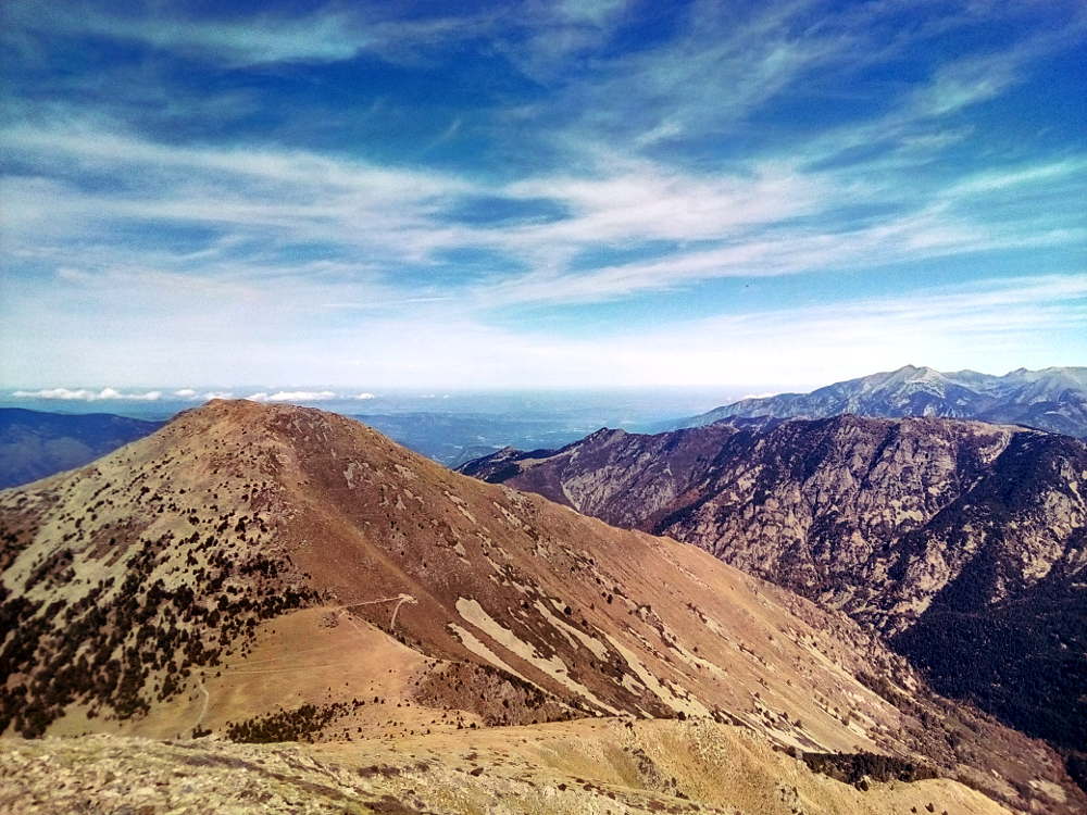 pic de redoun and pic du gallinas, 1500m above the hot springs, fontpédrouse in france. 10km to the spanish border. flat lands and sea in front of you, pyrenees‘ main ridge half a day of hiking behind you.